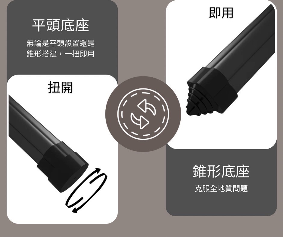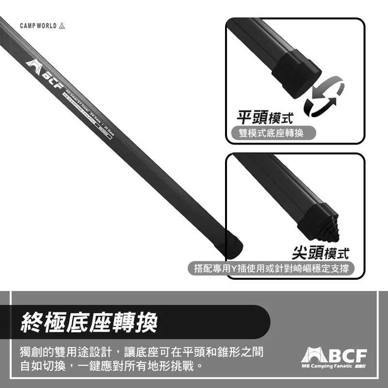 獨創的雙用途設計,讓底座可在平頭和錐形之間自如切換,一鍵應對所有地形挑戰。