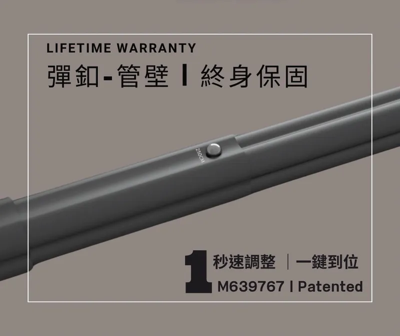 專利彈釦設計讓伸縮調節變得輕而易舉,實現秒換檔速度,無需費時尋找固定孔。